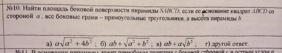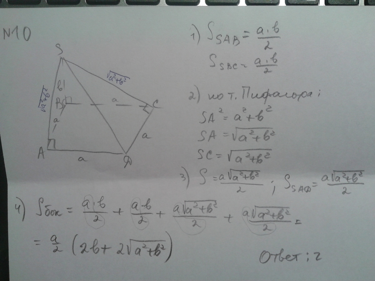 теперь чтобы найти площадь одной боковой стороны нужно основание (а) умножить на расстояние от вершины до боковой прямой (√(0,25a²+b²)) и разделить получившийся результат на 2