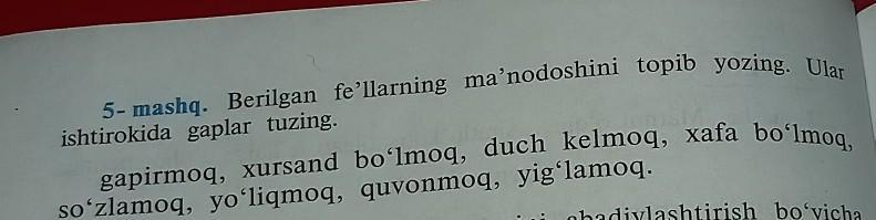 5- mashq. Berilgan fe'llarning ma'nodoshini topib yozing. Ular