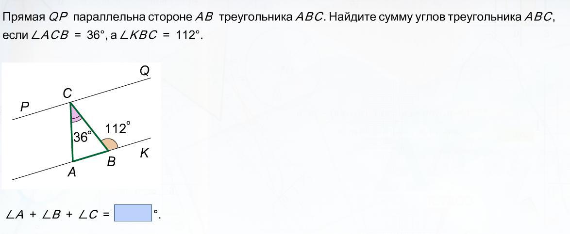 Прямая QP параллельна стороне AB треугольника ABC. Найдите сумму углов треугольника ABC, если угол ABC = 36 градусов, а KBC = 112 градусам