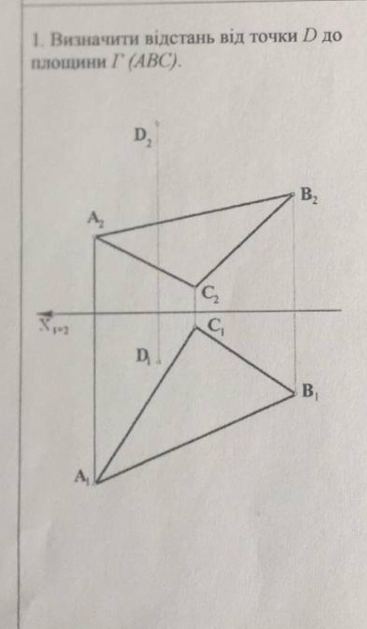 Построение перпендикуляра к плоскости АВС и определение натуральной величины расстояния от точки D до пл. АВС см. на фото.