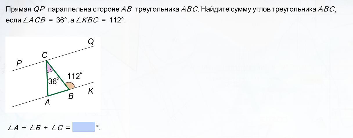 СРОЧНО ПОМОГИТЕ!!! Прямая QP параллельна стороне AB треугольника ABC. Найдите сумму углов треугольника ABC, если угол ABC = 36 градусов, а KBC = 112 градусам