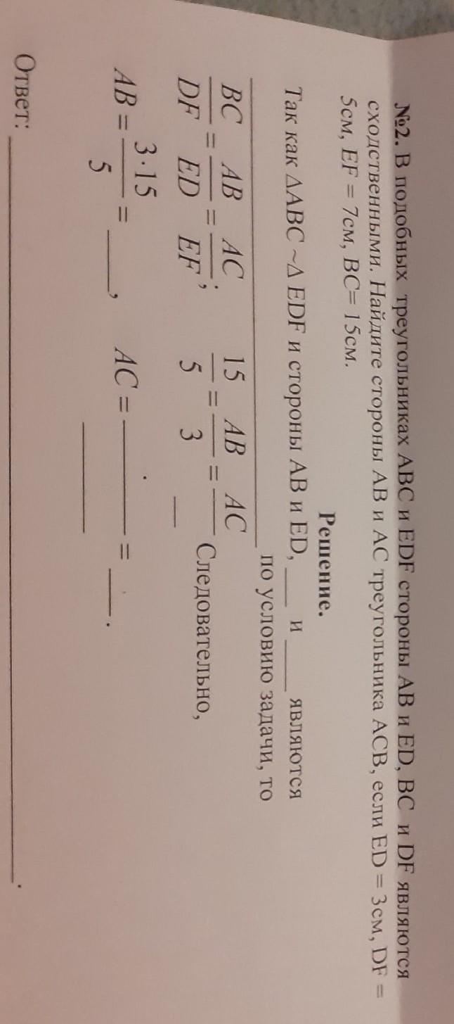 Так как треугольник ABC подобен треугольнику EDF и стороны AB и ED, BC и DF являются сходственными по условию задачи, то ... АС/7. Следовательно AB=(3*15)/5=9, AC=(15*7)/5=21