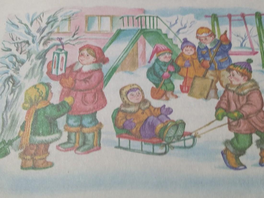 Школьники пришли на детскую площадку погулять. Они помогали малышам собирать снеговиков,кататься на санках