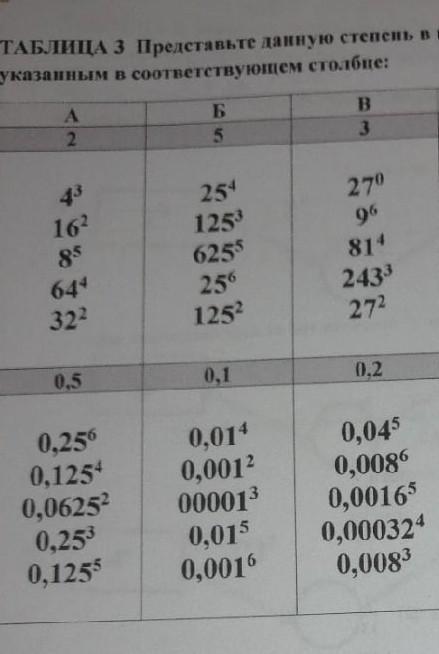 20 БАЛЛОВ! Задание:ТАБЛИЦА З Представьте данную степень в виде степени с основанием, указанным в соответствующем столбце