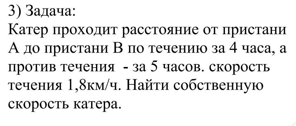 катер проходит расстояние от пристани А до пристани Б по течению за 4 часа, а против течения - за 5 часов, скорость течения 1,8 км/ч. Найти собственную скорость катера.
