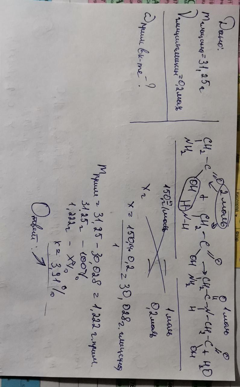 З аміноетанової кислоти масою 31,25 г отримали 0,2 моль дипептиду. Обчисліть масову частку домішок в аміноетановій кислоті.