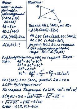 Через вершину A прямоугольного равнобедренного треугольника ABC с гипотенузой AB,равной 8 см,проведена прямая AD,перпендикулярная плоскости треугольника. Расстояние от точки D до плоскости ABC равно 2 см. Найдите расстояние от точки D до прямой BC.