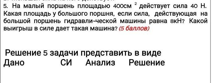 На малый поршень площадью 400см 2 действует сила 40 Н. Какая площадь у большого поршня, если сила, действующая на большой поршень гидравли-ческой машины равна 8кН? Какой выигрыш в силе дает такая машина? помогите пожалуйста!