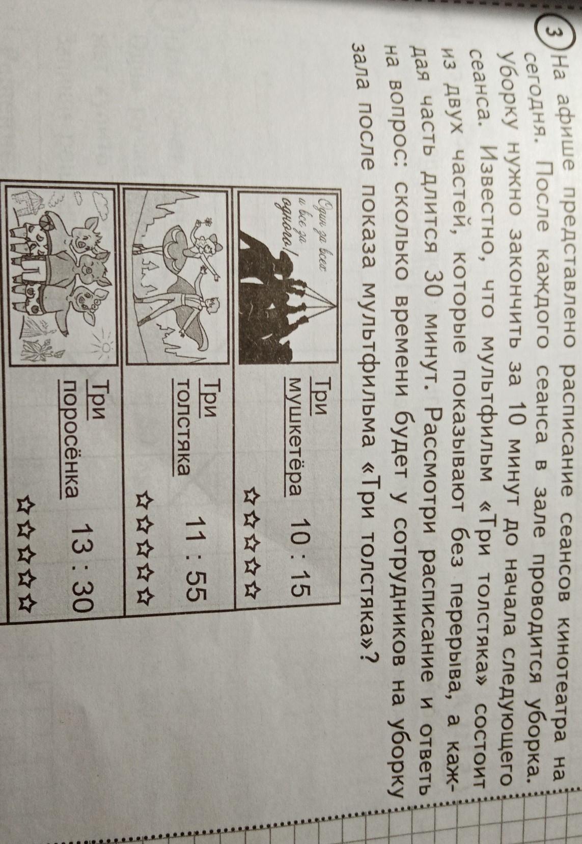 Известно что, мультфильм "Три толстяка" состоит из двух частей по 30 минут, и без перерыва, следовательно мультфильм будет идти 60 минут. Поскольку он начался в 11:55, он закончится в 12:55, а значит у сотрудников будет 35 минут до 13:30, когда начнется следующий мультфильм.