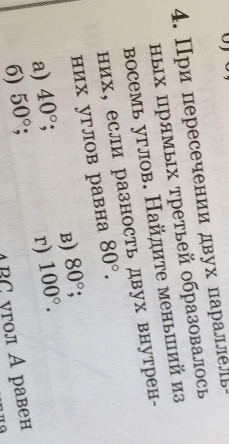 даю 10 балов при пересечении двух прямых третьей образовалось 8 углов. найдите меньший из них, если разность двух внутренних углов равна 80°