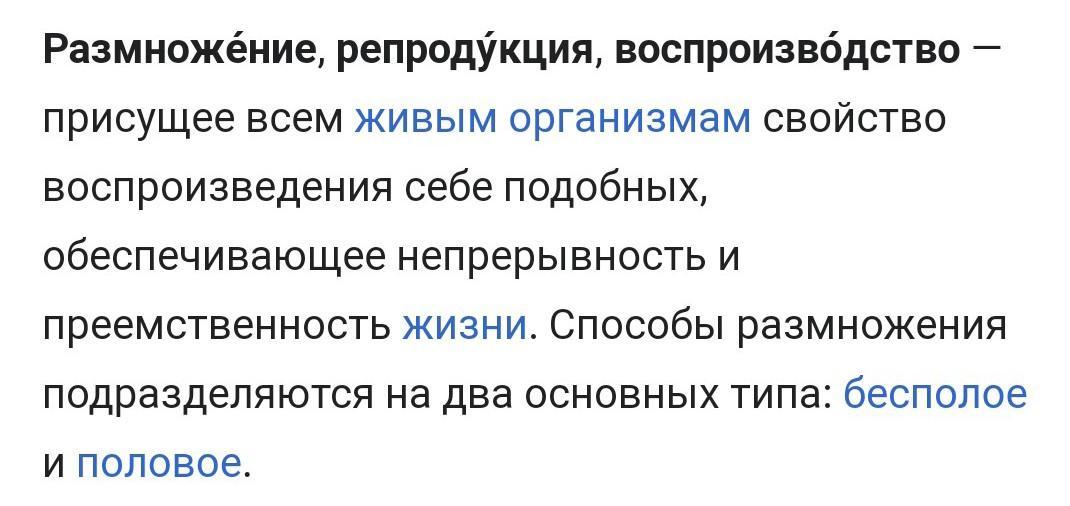 Размноже́ние, репроду́кция, воспроизво́дство — присущее всем живым организмам свойство воспроизведения себе подобных, обеспечивающее непрерывность и преемственность жизни. Способы размножения подразделяются на два основных типа: бесполое и половое. Для организмов, обладающих клеточным строением, в основе всех форм размножения лежит деление клетки. Читать ещё