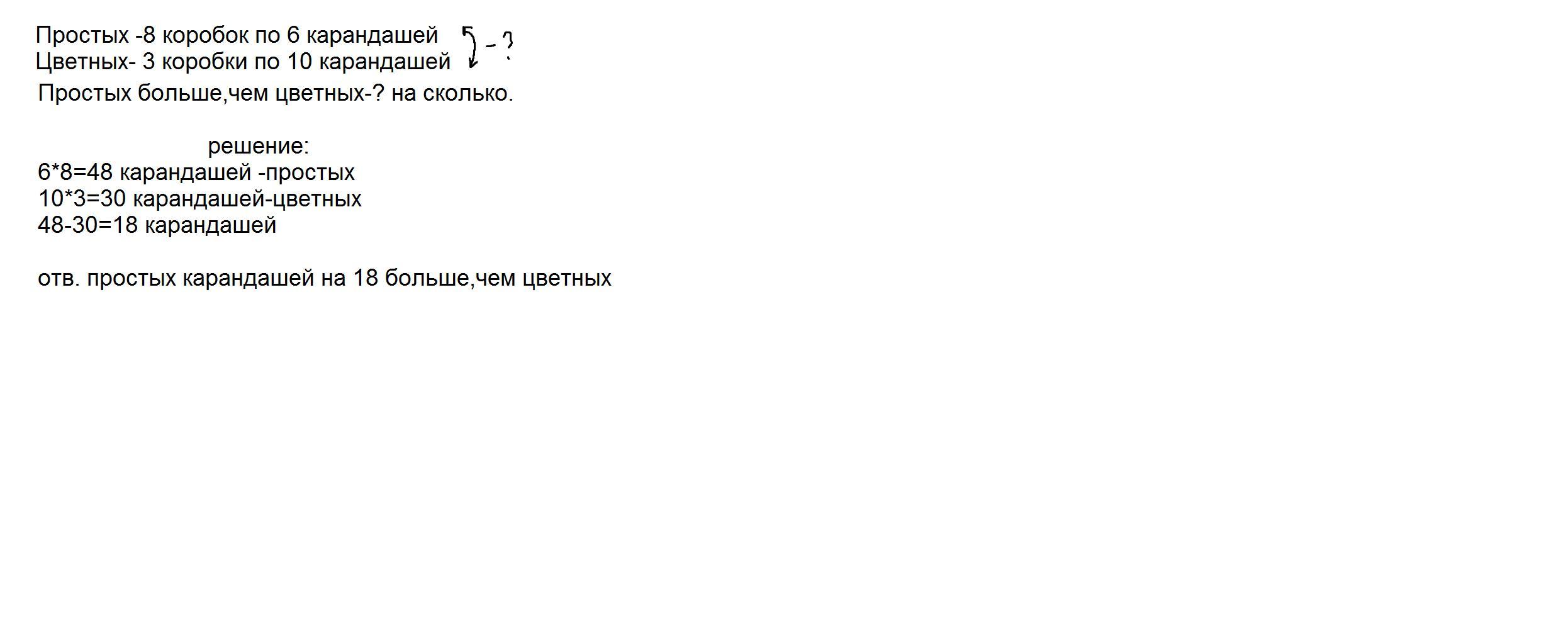 для гуртка малювання керівник придбав 8 коробок простих олівців по 6 олівців у кожній i 3 коробки кольорових по 10 олівців. на скільки більше керівник придбав простих олівців ніж кольорових?