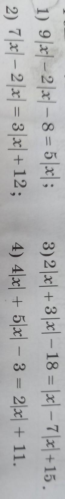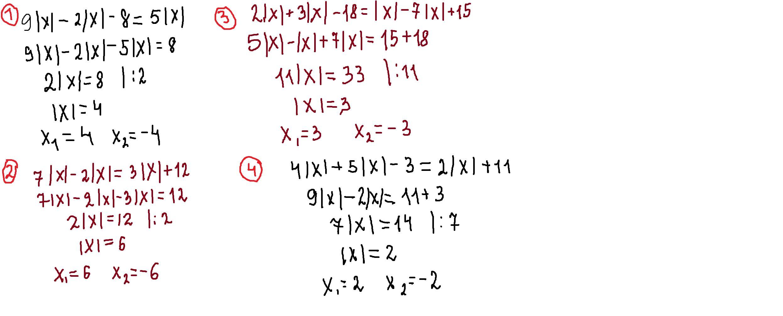 1)9x-2x-8=5x;2x=8;x=4;x=-4 2)7|x|-2|x|=3|x|+12;5x-3x=12;x=6;x=-6; 3)2|x|+3|x|-18=|x|-7|x|+15;5x-x+7x=15+18;11x=33;x=3;x=-3;4)4|x|+5|x|-3=2|x|+11;7x=14;x=2;x=-2