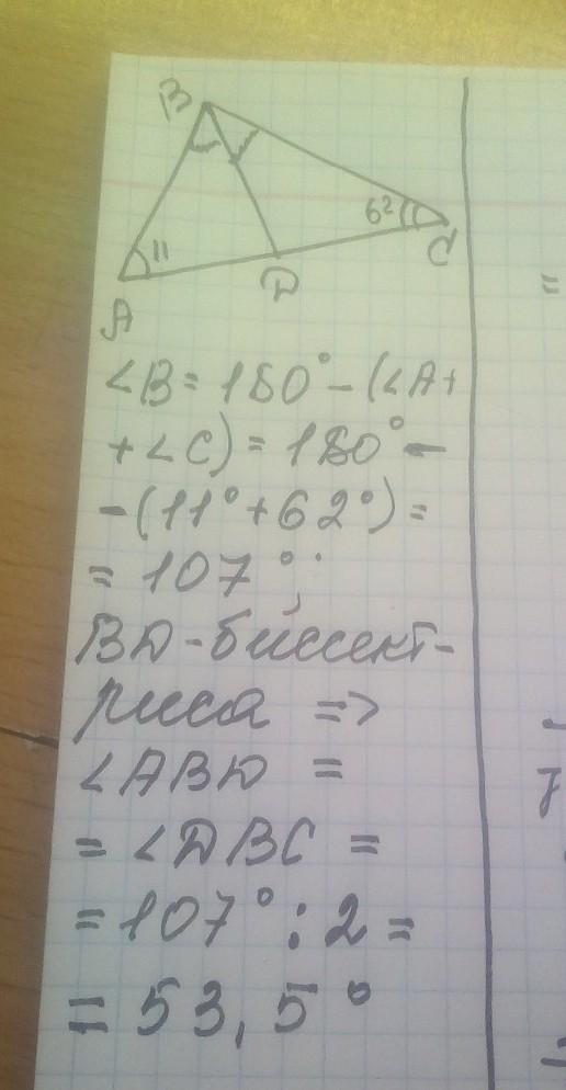 Дан произвольный треугольник BCD, в котором проведена биссектриса одного из углов. Известно, что два угла равны 11° и 62°, и проведённая биссектриса не имеет общих точек с вершинами этих углов. Вычисли, какой угол получился между этой биссектрисой и стороной угла, из которого она проведена.