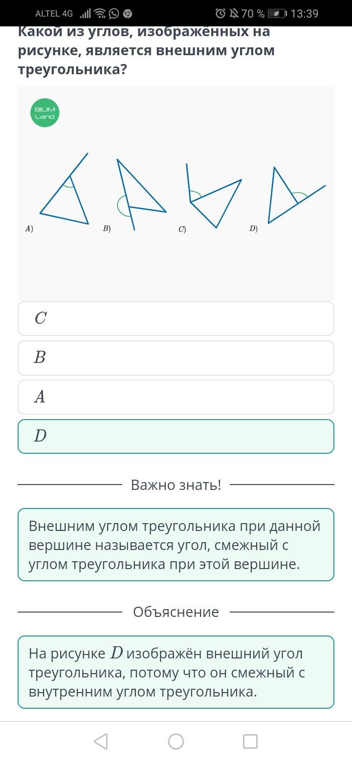 Сумма углов треугольника внешний угол треугольника Урок 2. Какой из углов изображенных на рисунках является внешним углом треугольника A, B, C, D.