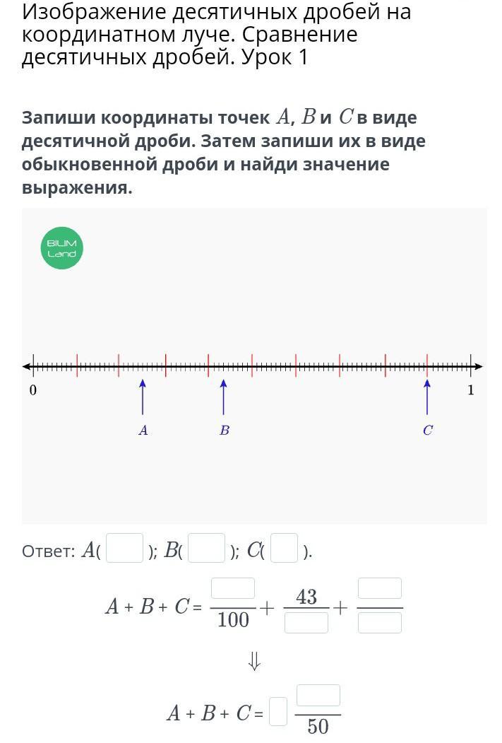 Запиши координаты точек A, B и C в виде десятичной дроби. Затем запиши их в виде обыкновенной дроби и найди значение выражения.