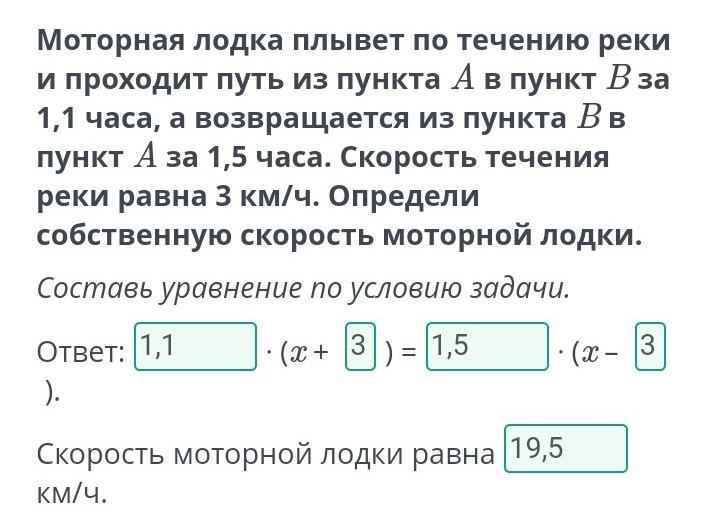 Моторная лодка плывет по течению реки и проходит путь из пункта A в пункт B за 1,1 часа, а возвращается из пункта B в пункт A за 1,5 часа. Скорость течения реки равна 3 км/ч. Определи собственную скорость моторной лодки.