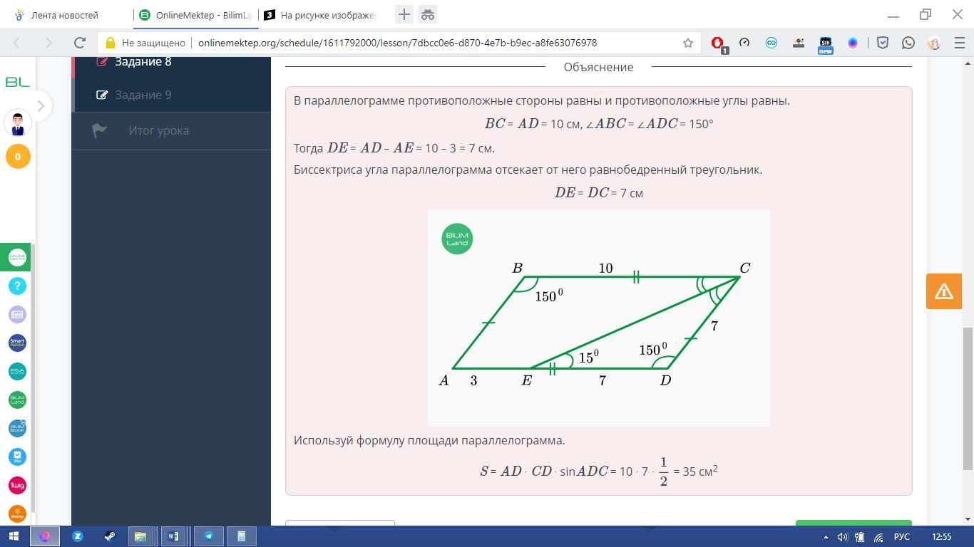 На рисунке изображен параллелограмм ABCD. Из угла C проведена биссектриса, которая пересекает сторону AD в точке E. Учитывая, что ∠B = 150°, ∠DEC = 15° и BC = 10 см, AE = 3 см, найди площадь параллелограмма.