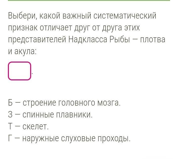 Выбери, какой важный систематический признак отличает друг от друга этих представителей Надкласса Рыбы — плотва и акула:
