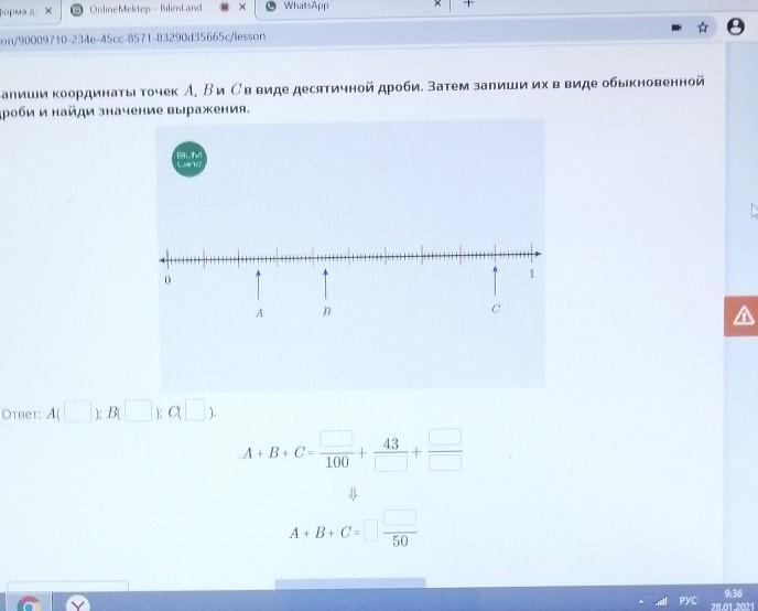 Запиши координаты точек A, B и Cв виде десятичной дроби. Затем запиши их в виде обыкновенной