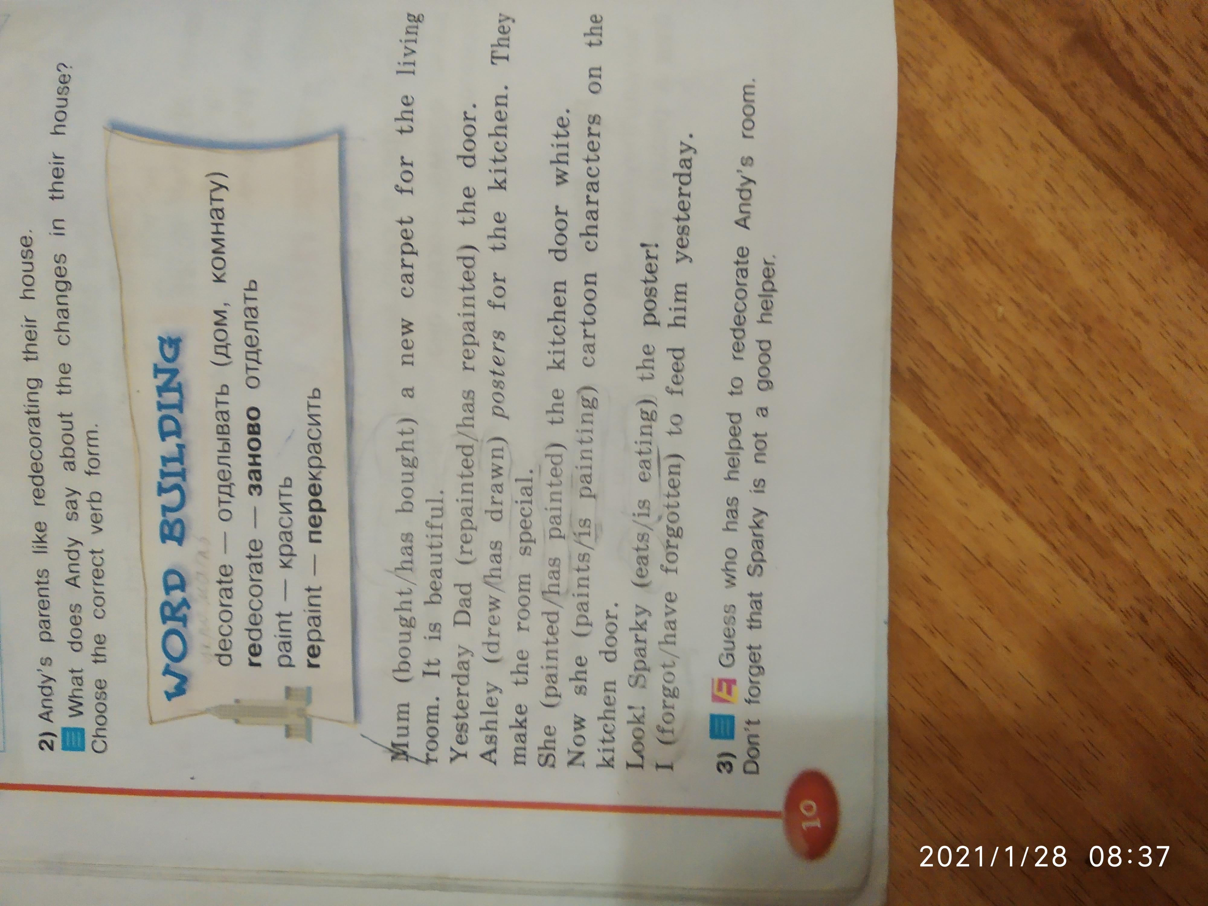 Ответ: has bought, repainted, drew, painted, is painting, eats, forgot