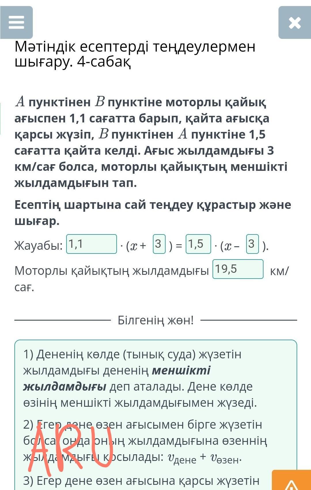 A пунктінен B пунктіне моторлы қайық ағыспен 1,1 сағатта барып, қайта ағысқа қарсы жүзіп, B пунктінен A пунктіне 1,5 сағатта қайта келді. Ағыс жылдамдығы 3 км/сағ болса, моторлы қайықтың меншікті жылдамдығын тап.