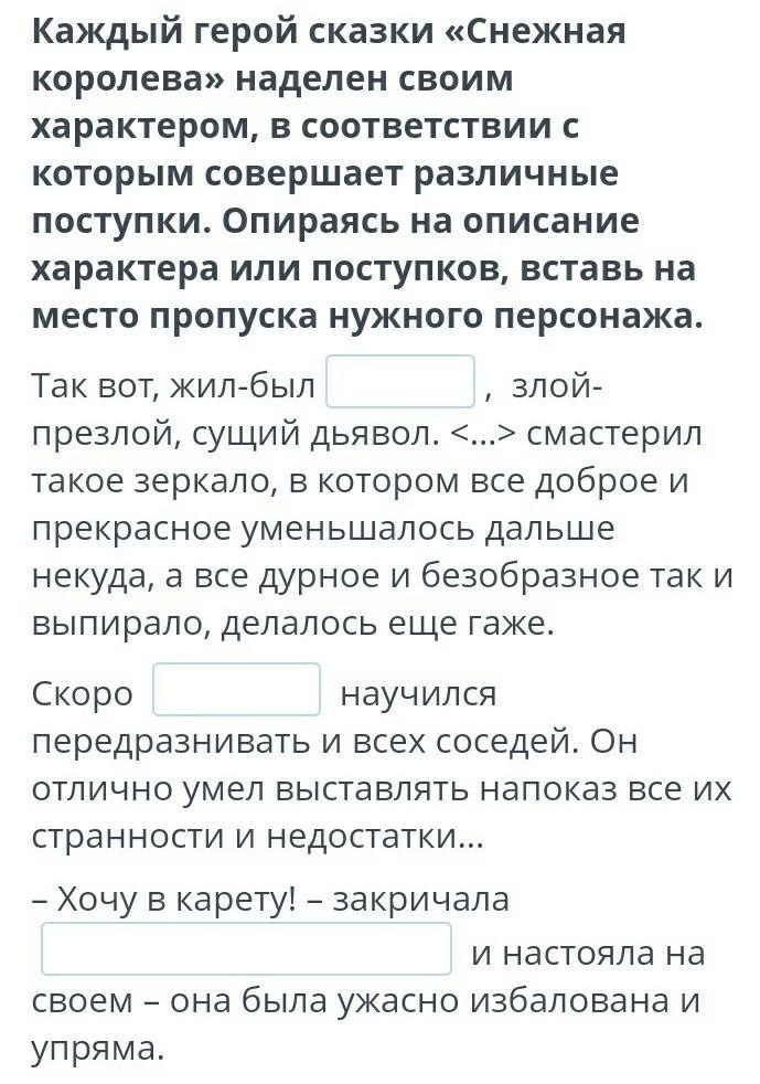 Каждый герой сказки «Снежная королева» наделен своим характером, в соответствии с которым совершает различные поступки. Опираясь на описание характера или поступков, вставь на место пропуска нужного персонажа.