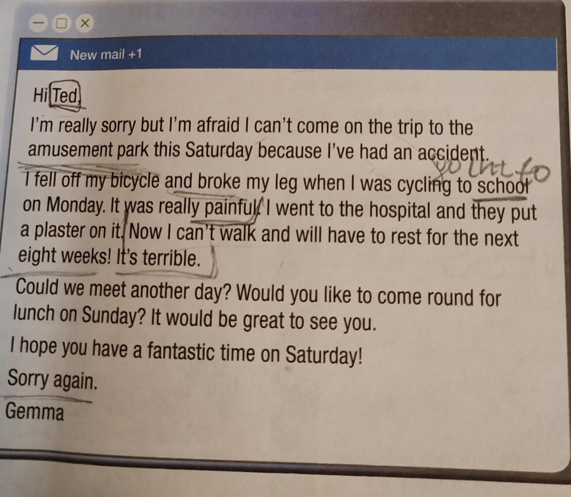 2 Read Gemma's email again and answer the questions. 1 Where can't Gemma go? 2 Why can't she go? 3 What does she need to do now? 4 What new plan does she suggest?