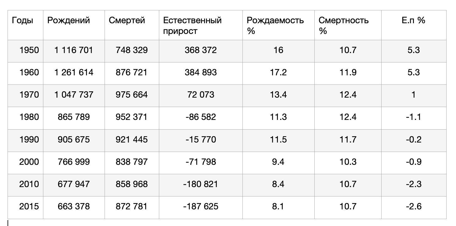 1990 год Рождении 905 675 Смертей 914 361 Естественный прирост -8 686 Коэффициент рождаемости 11.4 Коэффициент смертности 11.5 Естественный прирост -0.1