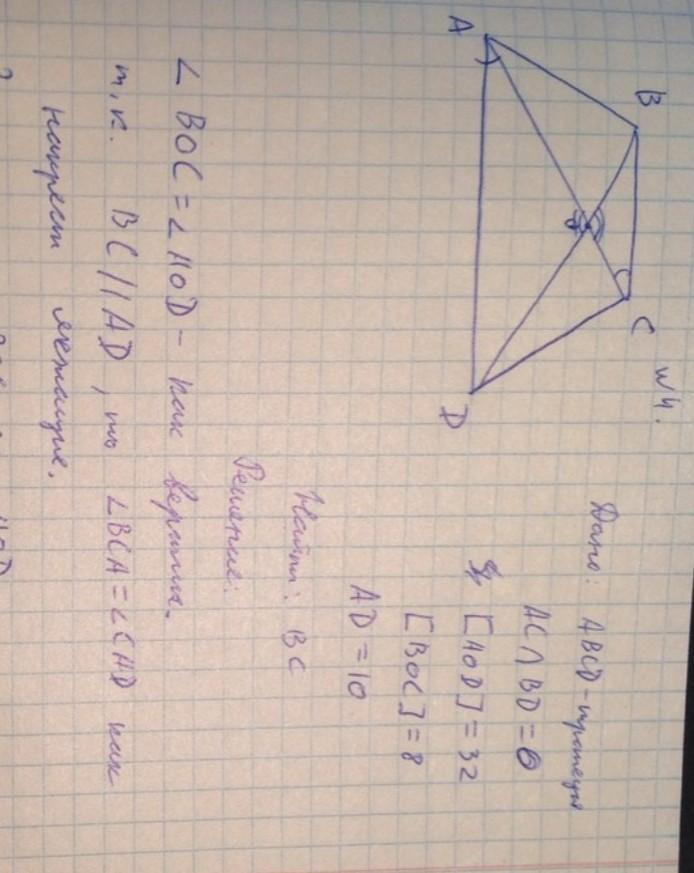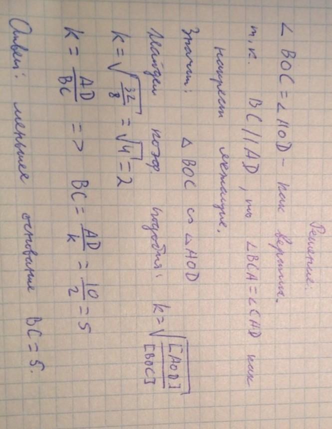 В трапеции ABCD (AD и BC -основания) диагонали в точке O, площадь АOD =32 см2, площадь BOC=8 см2. Найдите меньшее основание трапеции, если большее из оснований-10 см.