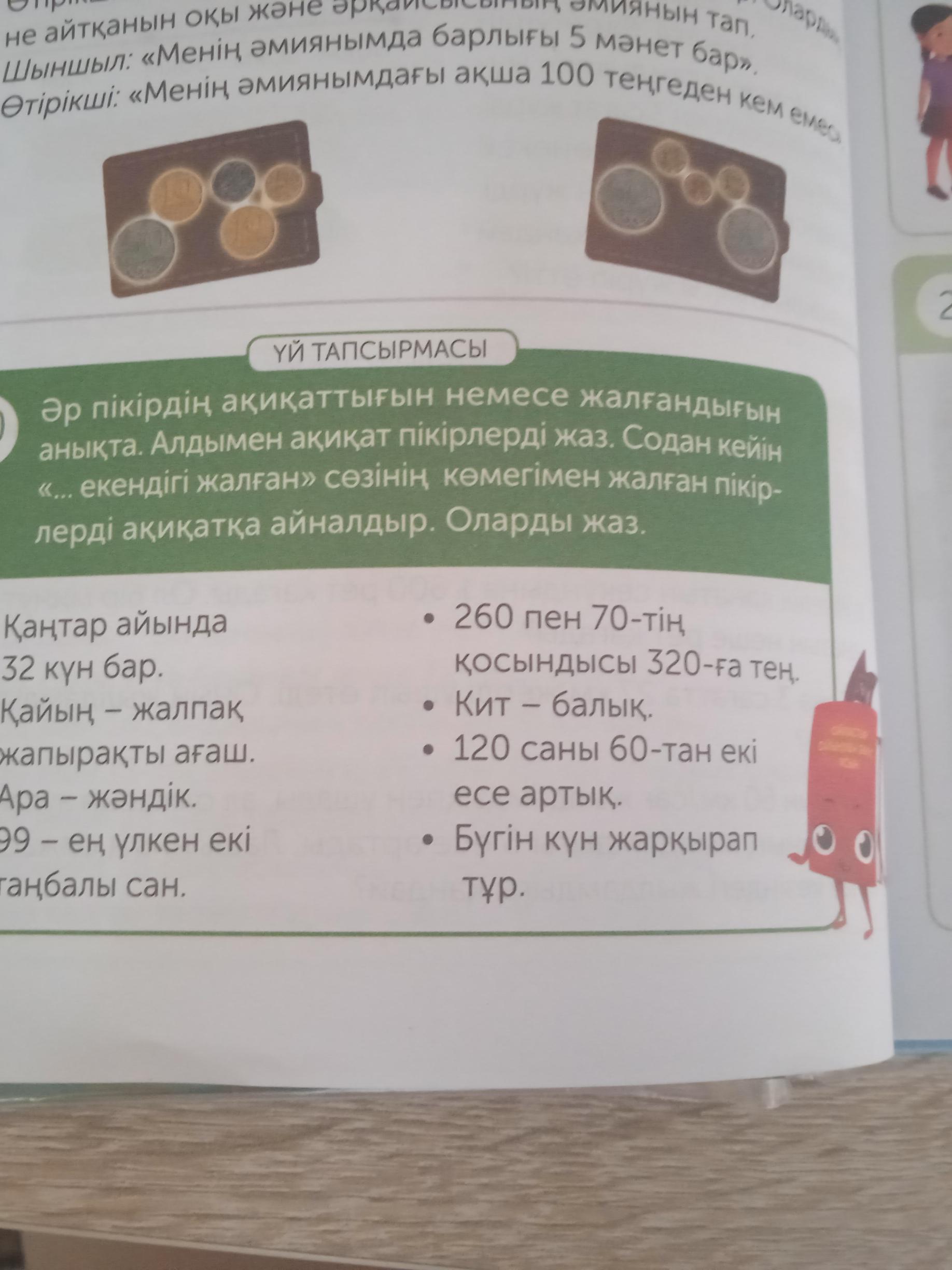 Қаңтар айында 32 күн бар екендігі жалған 31күн бар, Қайыңда жалпақ жапырақ емес кіші жапырақ, жалпақ екендігі жалған, 260қа 70санын қосқанда 320 емес 330 болады, 320 екендігі жалған