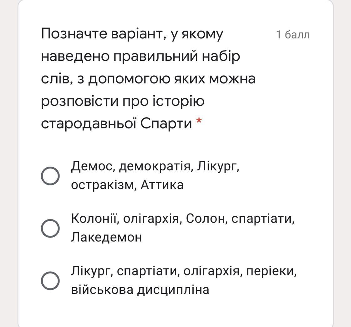 Ответ:Лікург, спартіати, олігархія, періеки, військова дисципліна