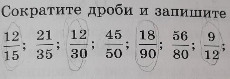 Типо все просто, каждое число в дроби делишь на самое большое возможное которое можно поделить на эти числа. Например 12 и 15 обамделляться на 3, выше не взять. тк 15 не делиться. Выходит что в первом 4 пятых.