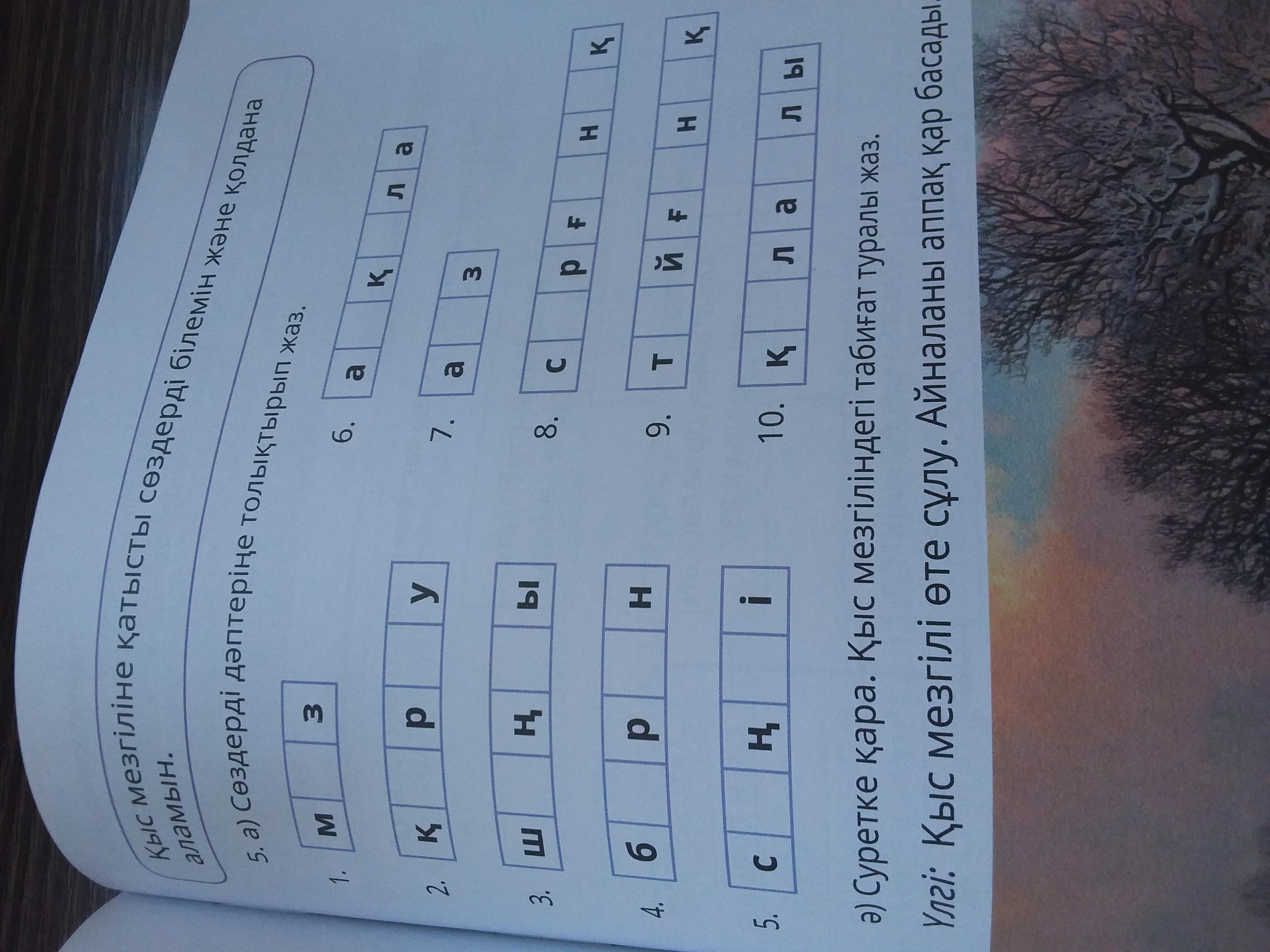 - 1)мҰз. 2)Кешір әлі білмеймін ! 3)Шаңғы 4)Боран 5) Кешір әлі білмеймін! 6) білмеймін 7) Аяз 8)сырғанақ 9)Тайғанақ 10) қолайлы