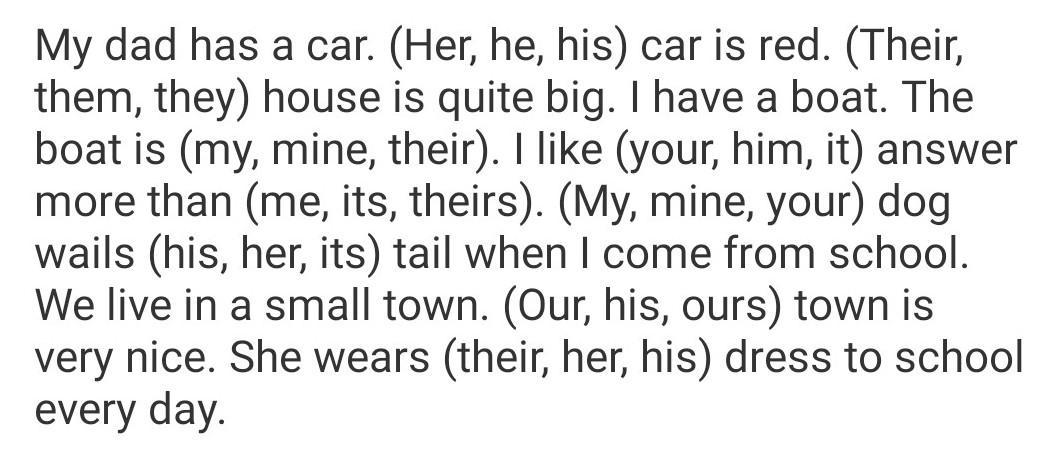 My dad has a car. His car is red. Their house is quite big. I have a boat. The boat is mine. I like your answer more than theirs. My dog wails its tail when I come from school. We live in a small town. Our town is very nice. She wears her dress to school every day.