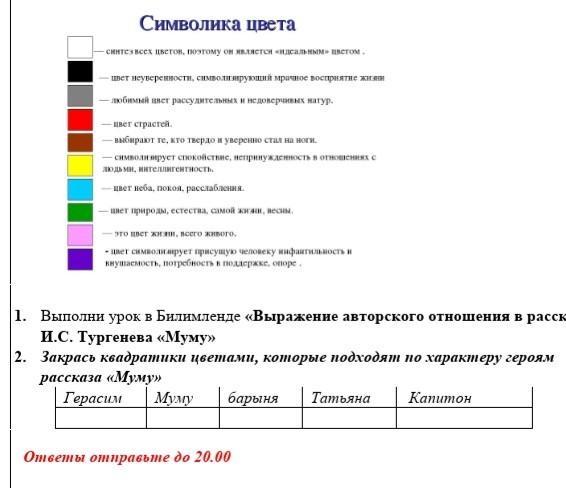 Герасим - голубой, жёлтый; Муму - розовый; барыня - коричневый; Татьяна - белый; Капитон - чёрный;