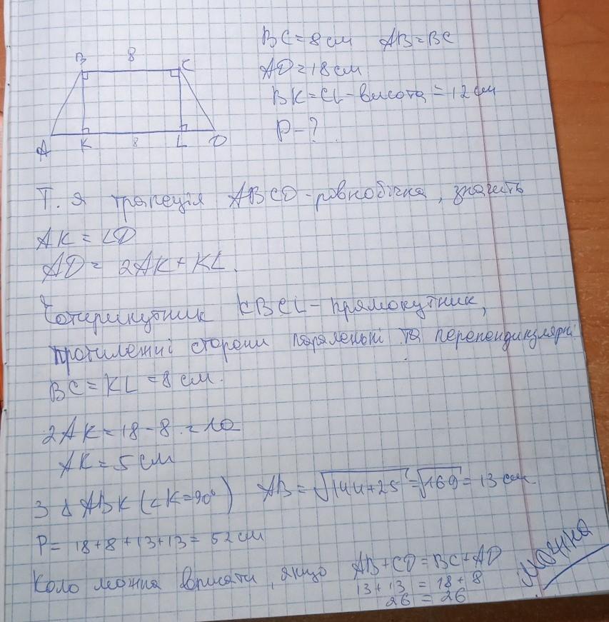 Основи рівнобічної трапеції дорівнюють 8 см і 18 см, а висота 12 см. Знайдіть периметр трапеції. Чи можна вписати в неї коло? с рисунком