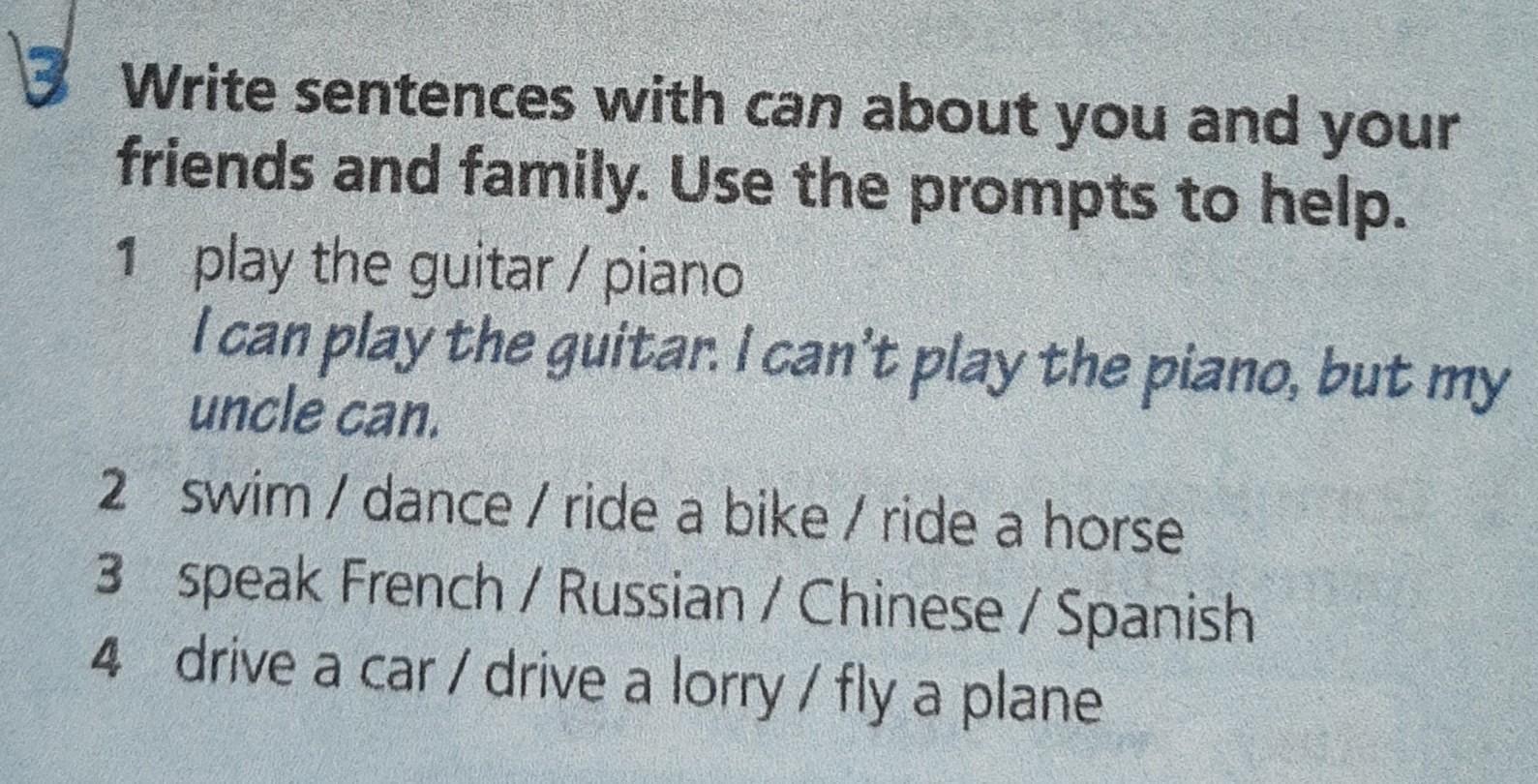 2.I can swim. I can't ride a bike, but my sister can ride a horse.