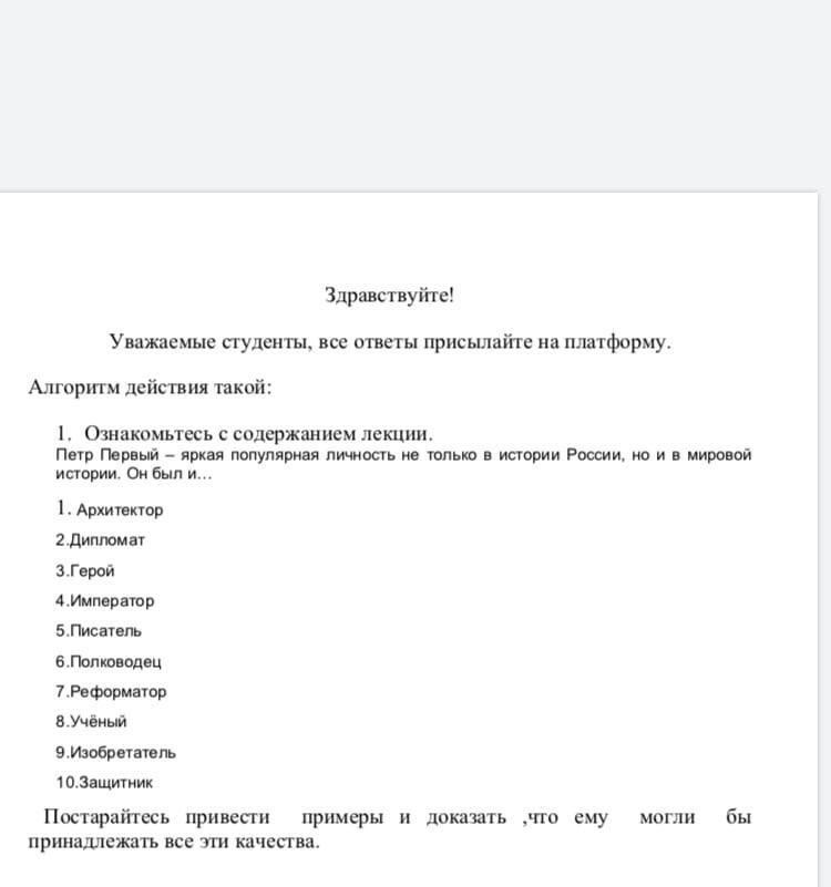 Император- после выдающейся победы над Щвецией провозгласил себя первым императором Российским в 1721 году. Полководец возглавил Прутский поход 1710-1711. Реформатор (реформы государственного управления, социально-экономические и тд.) Писатель - литературно педагогическое произведение, содержащие правила и нормы поведения для молодых дворян, «юности честное зерцало». Защитник - основал российский флот, тем самым обезопасил морские границы России. Герой Пётр лично участвовал в гангутской битве 1714, показав героизм при абордажной атаке. Учёный- создал первый естественно-научный музей -Кунсткамеру .