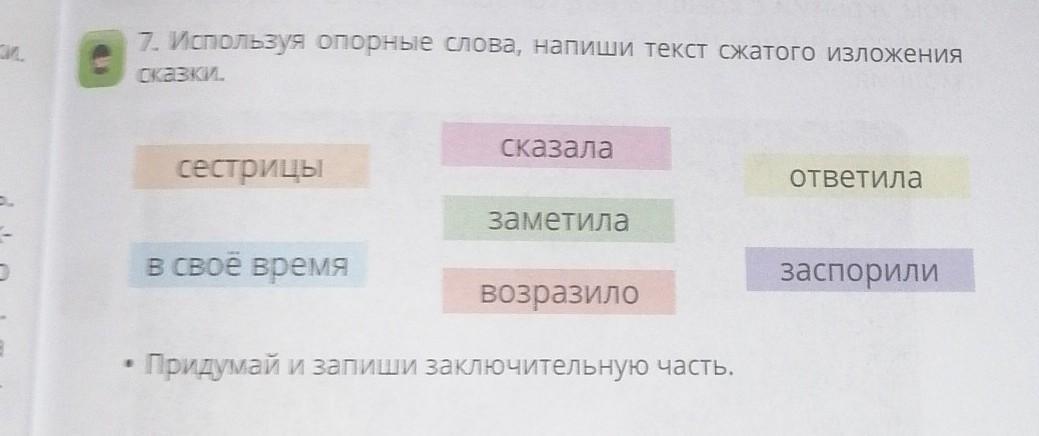 используя опорные слова, напиши текст сжатого изложение сказки. придумай и запиши заключительную часть. сестрицы, в своё время, сказала, заметила, возразила, ответила, заспорили . Пж мне срочно надо. Упр7
