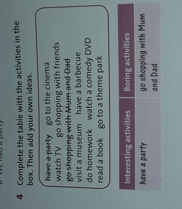 go to the cinema , go shopping with friends , visit a museum , have a bardecue , watch a comedy DVD , go to a theme park