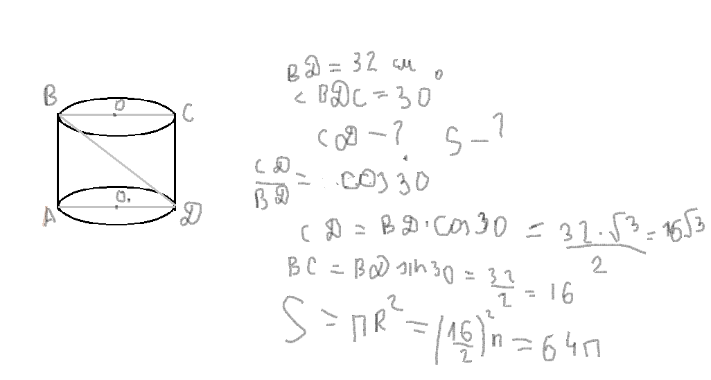 диагональ осевого сечения цилиндра равна 32 см у наклонена к плоскости его основания под углом 30 градусов. найдите высоту и площадь основания цилиндра.