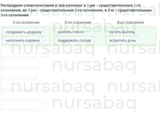 Распредели словосочетания в три колонки: в 1-ую – существительные 1-го склонения, во 2-ую – существительные 2-го склонения, в 3-ю – существительные 3-го склонения.