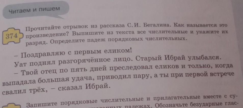 Упр. 374 Прочитайте отрывок из рассказа С. И. Бегалина. Как называется это произведение? Выпишите из текста все числительные и укажите их разряд. Определите падеж порядковых числительных.
