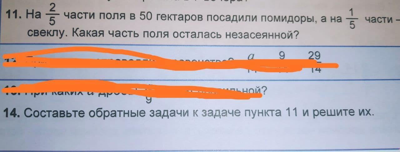 2/5+1/5=3/5 поля засеяно 1-3/5=5/5-3/5=2/5 поля не засеяно (не пойму, зачем даны га, если говорят о частях) 50*3/5=30 га засеяно 50-30=20 га не засеяно