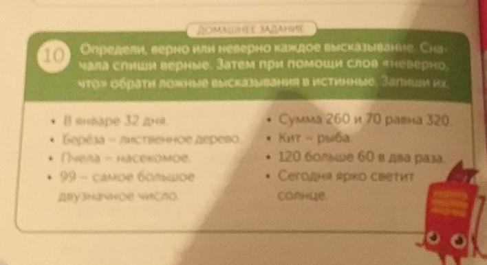 НЕВЕРНО - В январе 32 дня, сумма 260 и 70 равна 320, кит - рыба, сегодня ярко светит солнце.