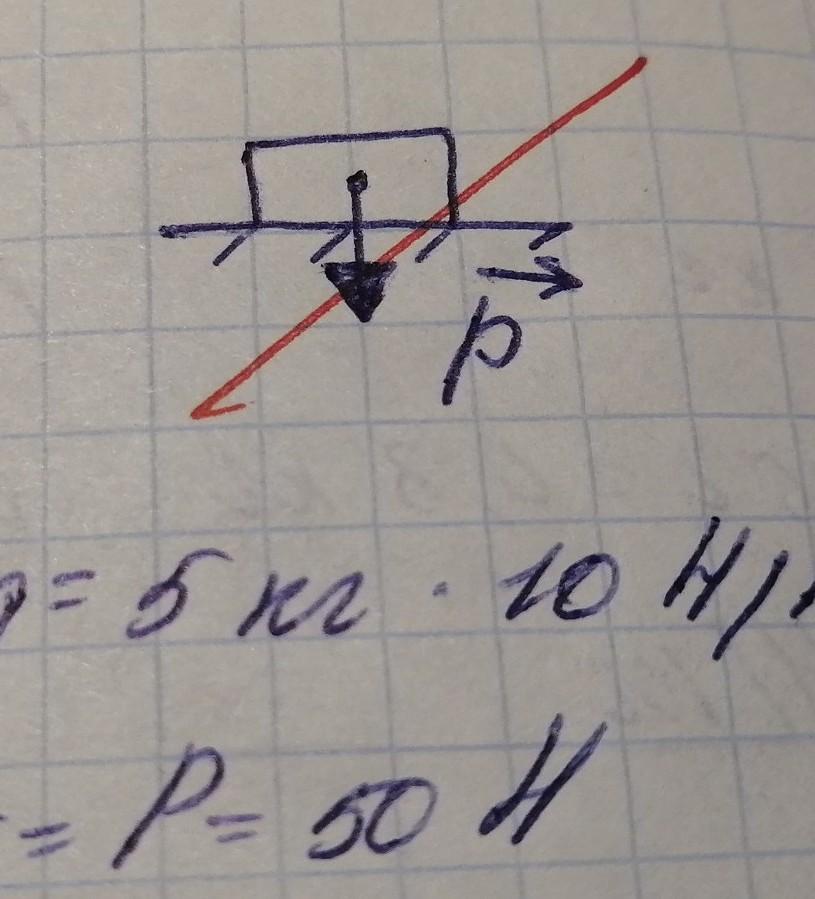 Также на моём рисунке соблюдён интервал. Одна клеточка = 10 Н. Так как сила тяжести и вес = 50 Ньютонам, то графическое изображение сил будет в 5 клеточек. Если этого не требуется, то не заморачивайся и просто начерти правильно, куда они направлены)