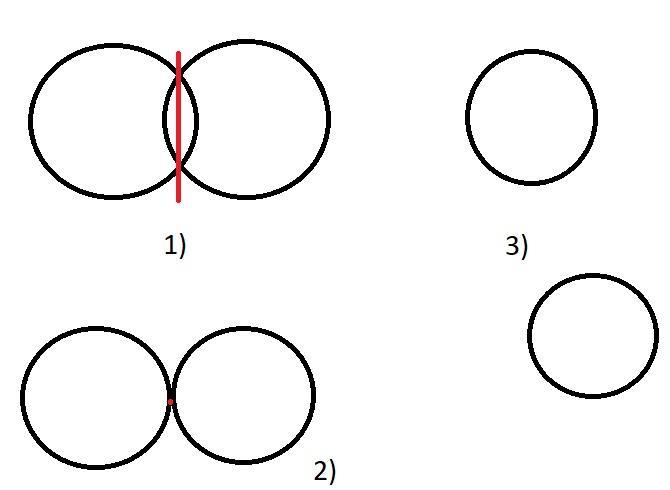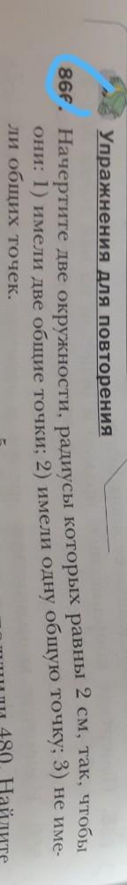 866. Начертите две окружности, радиусы которых равны 2 см так что бы они 1) имели две общие точки 2) имелииодну общую точку 3) не имели общих