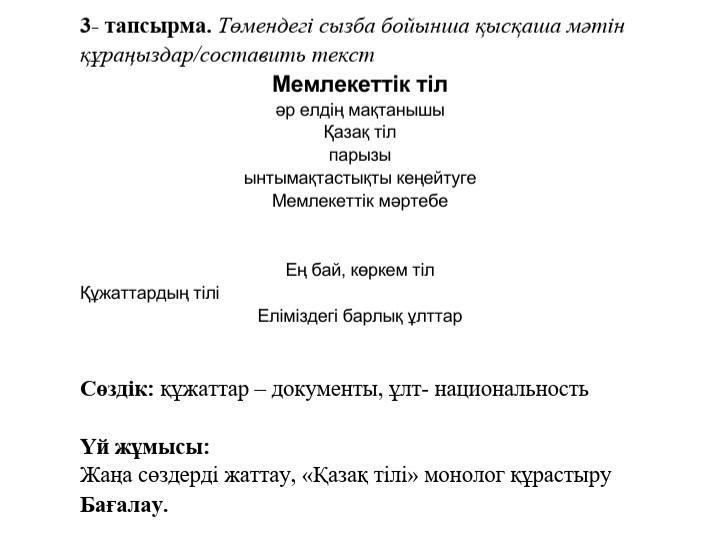Ана тілім-ата-бабамыздан мирас болып келе жатқан баға жетпес мұра. Демек әр адам ана тілін көзінің қарашығындай қорғауға, оның тазалығын сақтауға тиіс. Амал не, туған тілімізді шұбарлап, басқа тілдің сөздерімен араластырып сөйлейтіндерді жиі көремін. Тіпті, туған тілінен безетін сорақыларды да, менсінбеушілікпен қарап, қазақша сөйлеуге ұялатындарды көргенде, белгілі орыс жазушысы К.Г.Паустовскийдің «Туған тіліне жаны ашымаған адам – жәндік» деген сөзі ойыма еріксіз оралады.