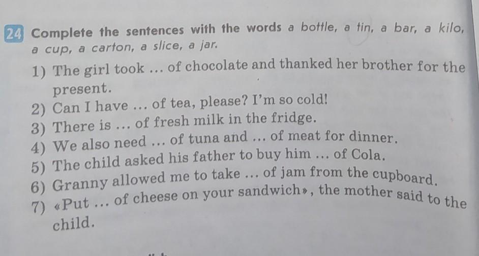 Complete the sentences with the words a bolile, a tin, а bar, a kile,
